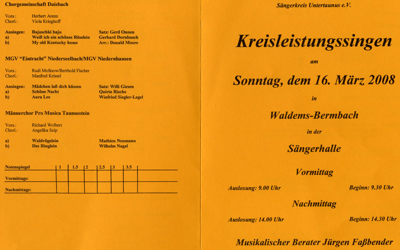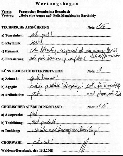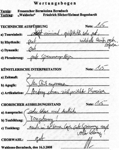 Der Juror Jürgen Fassbender würdigte in beiden Fällen die gute Chorwahl und den sehr gut geschulten chorischen Ausbildungsstand. In der technischen Ausführung hob er den guten Spannungsaufbau und die exakte Rhythmik hervor. In der künstlerischen Interpretation erfreute er sich an sehr guter Artikulation und gelungener Tempowahl. Insgesamt vergab er fünf Mal die Note 1,5 und ein Mal die Note 1,0.